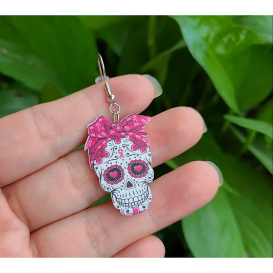Floral Skull Earrings-Pink (w/Pink Breast Cancer Ribbon Logo)