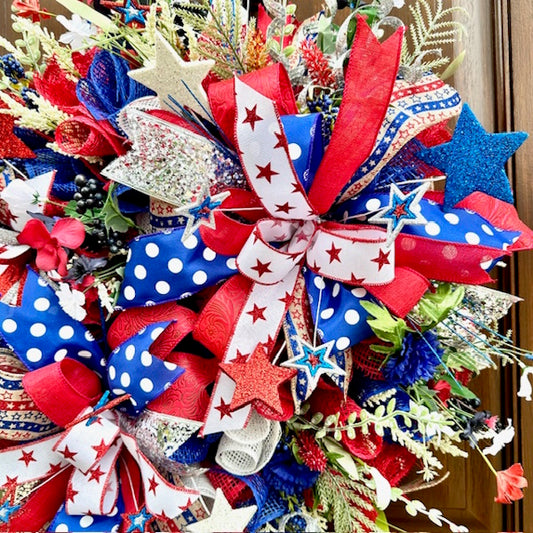Patriotic Wreath with Stars and Polka Dot Ribbon-Handmade