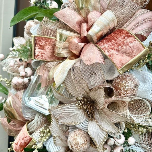 Each wreath is unique and thoughtfully created with hand-picked materials-some high-end designer quality, some budget oriented, but I use the items I feel are best suited for each piece! They can be stuffed full of florals, custom wired handmade bows and various themed attachments to create an over-the-top presentation, however, I do simple and understated as well. The wreaths you see here are a small representation of what can be created, and additional items such as floral swags, centerpieces, lanterns and garlands can also be personally designed for you. I welcome custom orders and will collaborate with you directly to design the theme, style, size and budget that works for you!