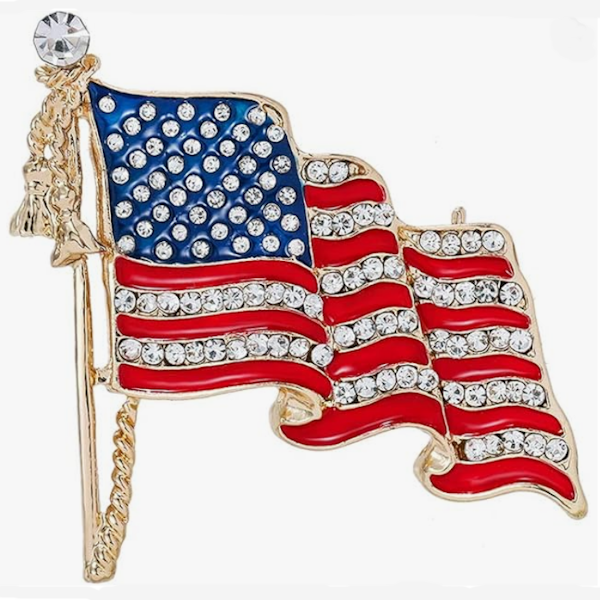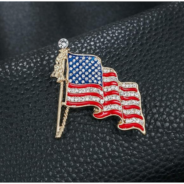 - Show your American pride and patriotism with this patriotic flag lapel pin, gold color, embellished with clear crystals