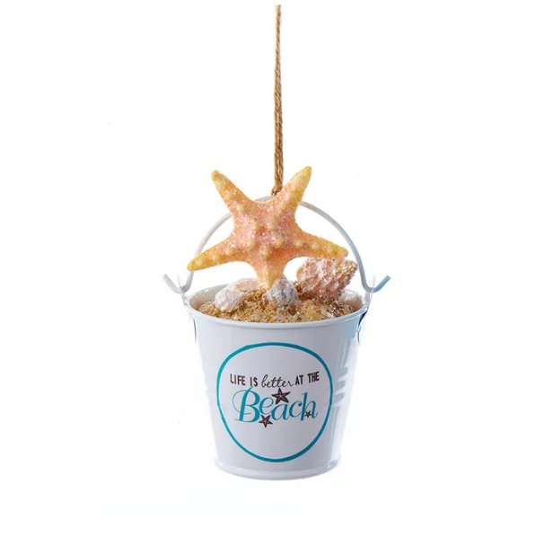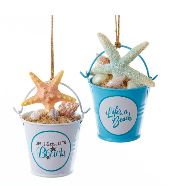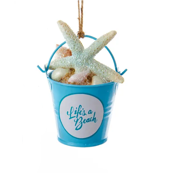 - Celebrate the holidays at the beach with these Sand Bucket Ornaments from Kurt Adler. Each ornament features a beach bucket with a fun saying filled with sand, seashells, and a starfish. The white bucket read, "Life Is Better At The Beach," and the blue bucket reads, "Life's A Beach." Each sold seperately.