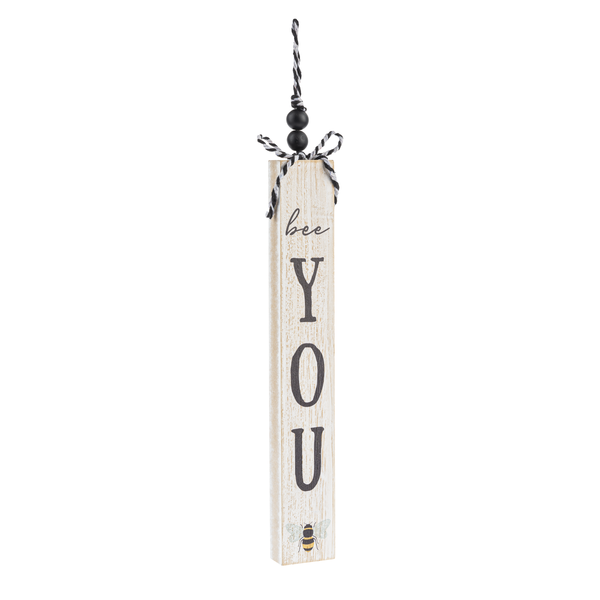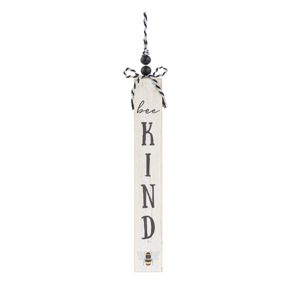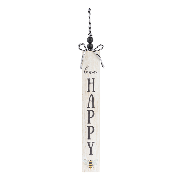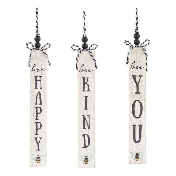 - A boho, rustic look, white-washed waxed wood chunky sign with painted bee motif and 3 cheerful bee phrases to choose from (sold seperately). "Bee Happy", "Bee Kind" or "Bee You". Black wood beads and black and white stripe cotton hanger complete the look.