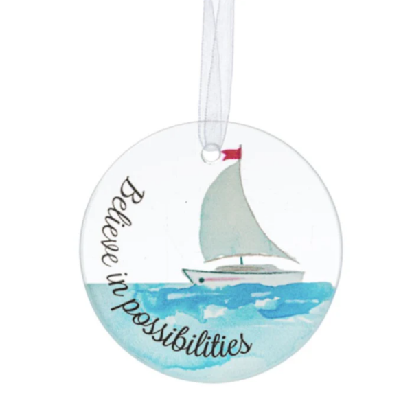 - 'Believe in Possibilities' round glass ornament with a little sailboat. Great on it's own, or fun to attach on to a bigger gift or wine bottle as a unique gift tag (PRO TIP-use Sharpie Pens to personalize a name on the glass!)