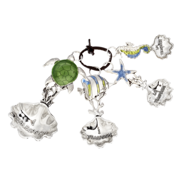 - Includes 1 ea. of 1 tbsp., 1 tsp., 1/2 tsp., 1/4 tsp. Colorful coastal-themed enamel design on front, plain silver and different design on backside, knotted together with a faux leather tie