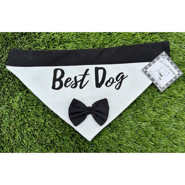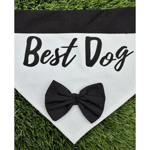 - Make sure Man (& Woman's) Best Friend has a part in your wedding with the help of this adorable dog accessory! An ivory canvas bandana for your canine bestie, featuring a black bow tie & the phrase 'Best Dog'! written in black font. Black trim at top has 1.5" slits that the collar goes through. Fits up to 1" width dog collars. Perfect for the Big Day!