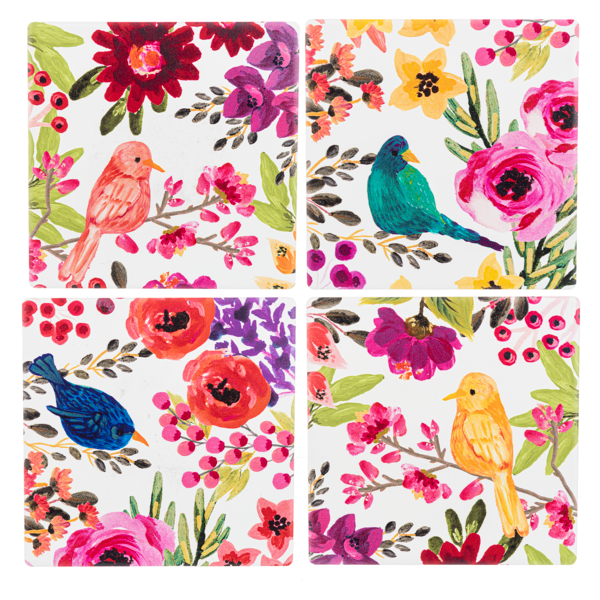 - Four vividly bright and cheerful bird-themed floral coasters, each one unique and different. A great gift to brighten someone's day! Gift boxed