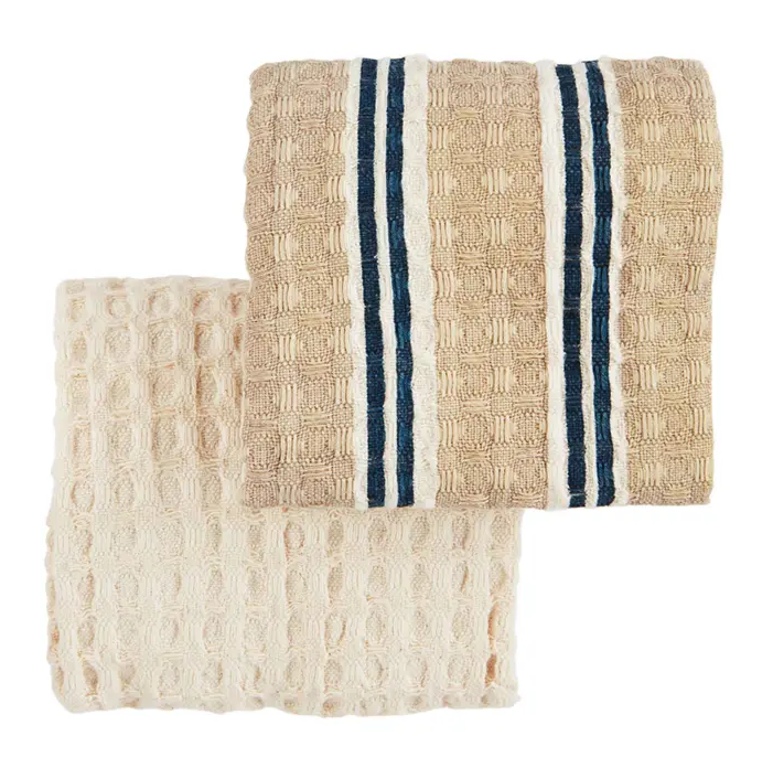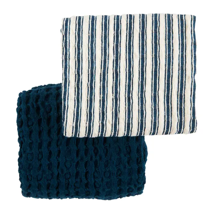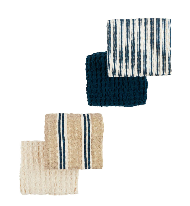 - Choice of taupe with navy/cream stripe and solid cream set or navy and cream "ticking" stripe with solid navy set