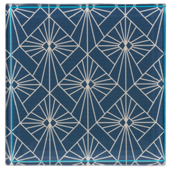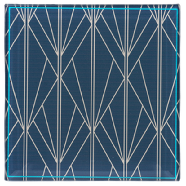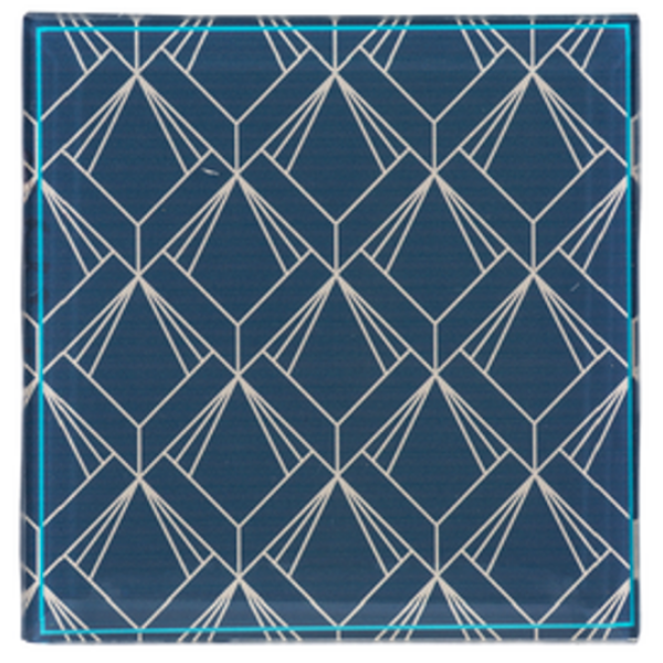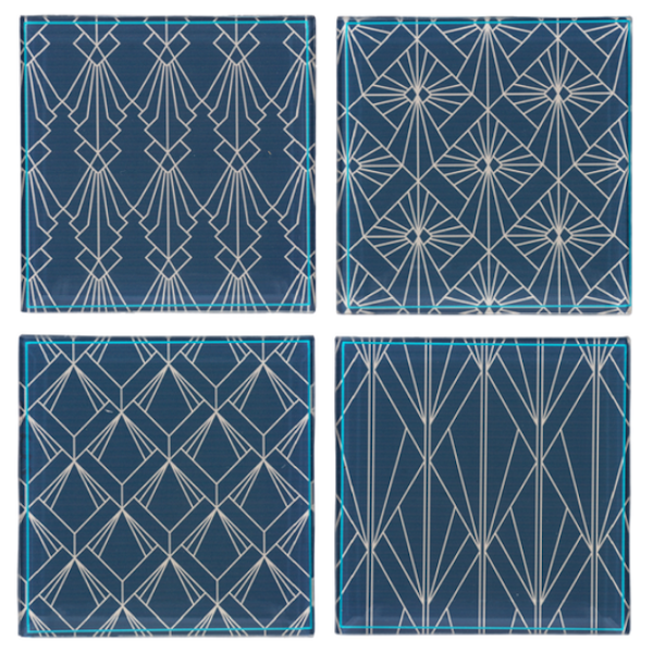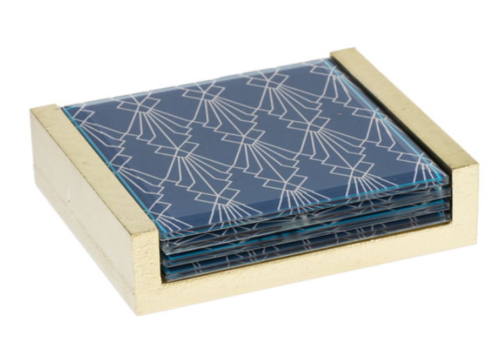 - Set of 4 assorted glass beveled edge coasters in deep teal blue color and metallic gold box