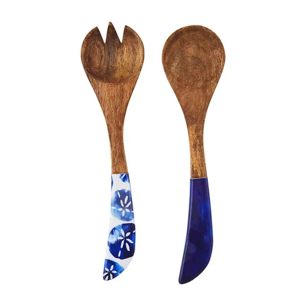 - Our Blue Sea Serving Utensils features the colors of the beach! The two piece set comes with two mango wood serving utensils. The utensils feature enamel dipped handles. The handles feature delicate blue beach patterns. The set comes with a fork utensil and a spoon utensil, perfect for salad serving. Colors may have variation.