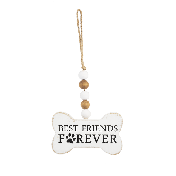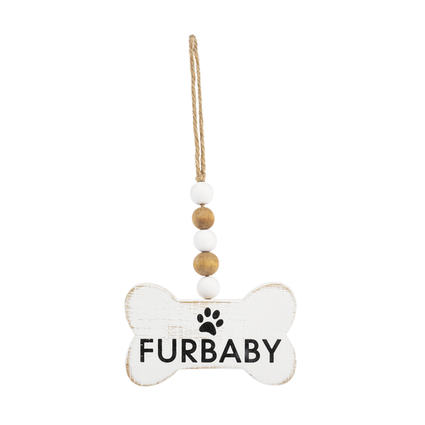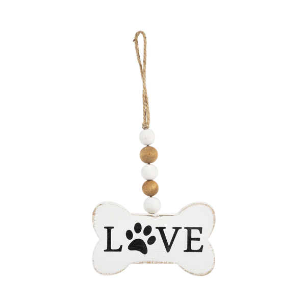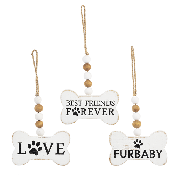 - Bone-shaped oversized ornaments, white with black words and bead accents. Choose from "Love", "Best Friends Forever" or "Furbaby", each with special pawprints in wording