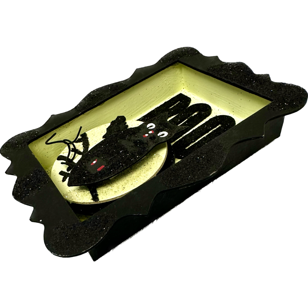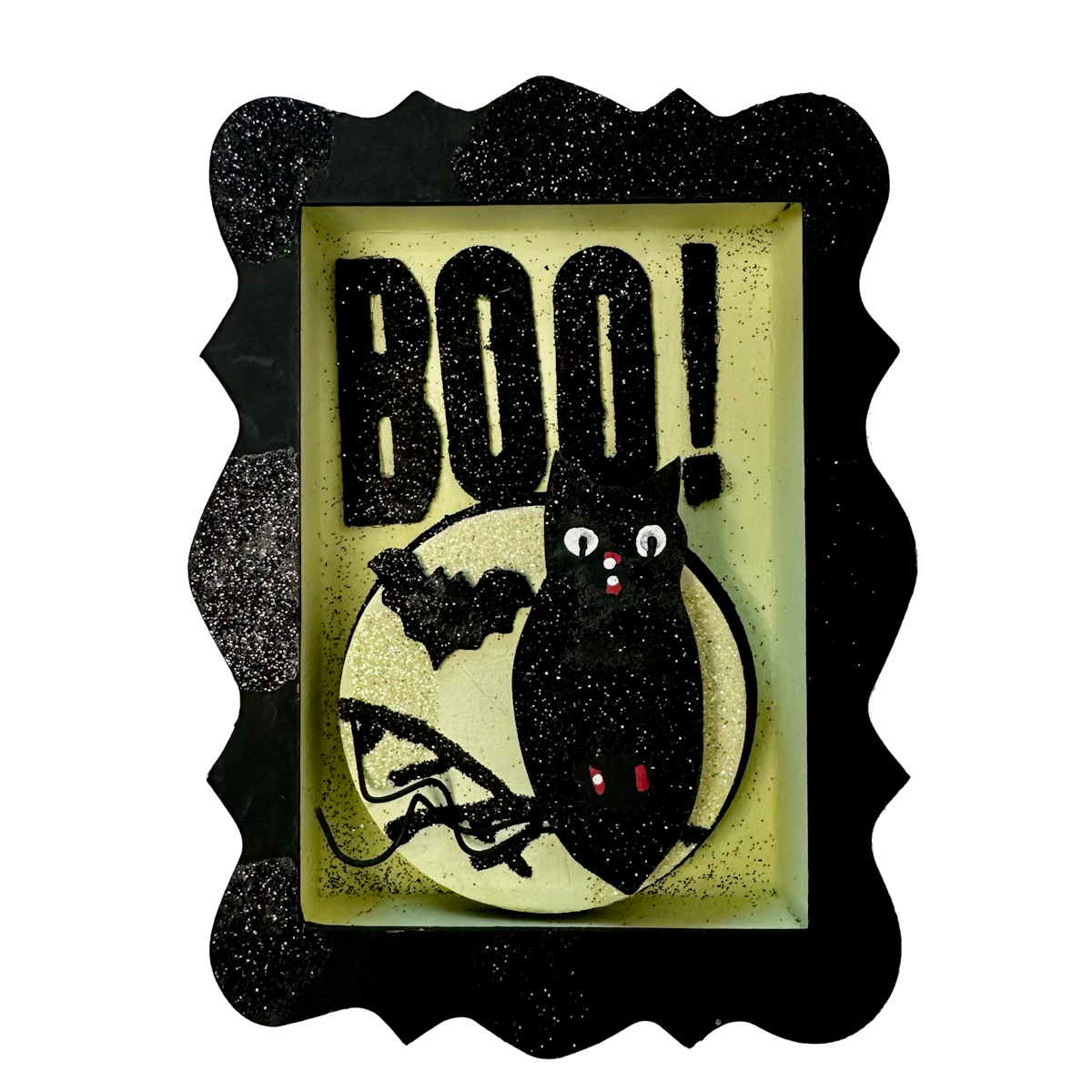 - BOO! Dimensional, glittered picture frame style Halloween decoration with owl, bat and full moon