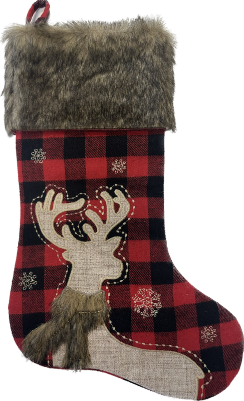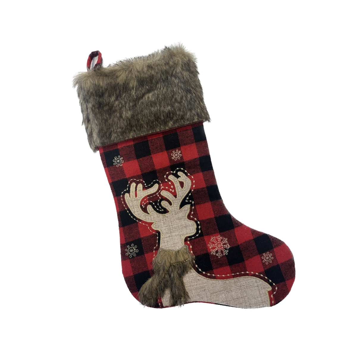 This flannel buffalo plaid stocking features a linen reindeer and embroidered snowflakes, with a faux mink cuff and scarf for added texture. Perfect for adding a touch of rustic cabin charm to your holiday decor.