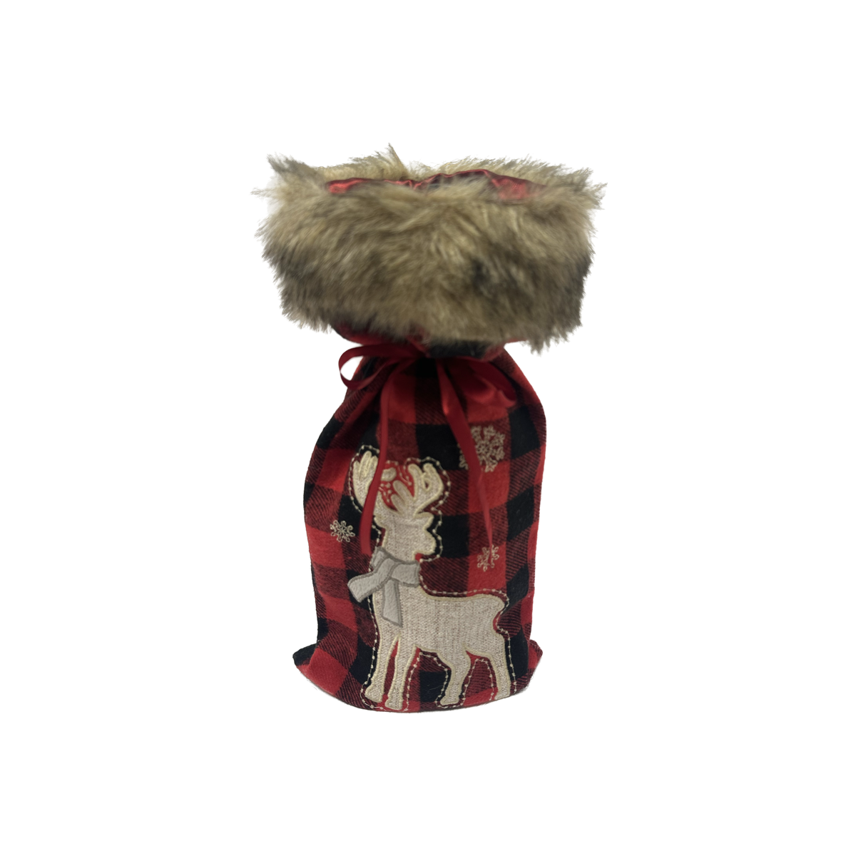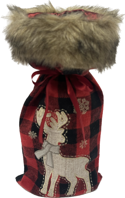 Transport and present your holiday wine in style with our Buffalo Plaid Wine Bag. The bold buffalo plaid design is accented with festive embroidered reindeer and snowflakes. The faux fur cuff adds a touch of elegance and luxury, making it the perfect gift for the wine lover in your life.