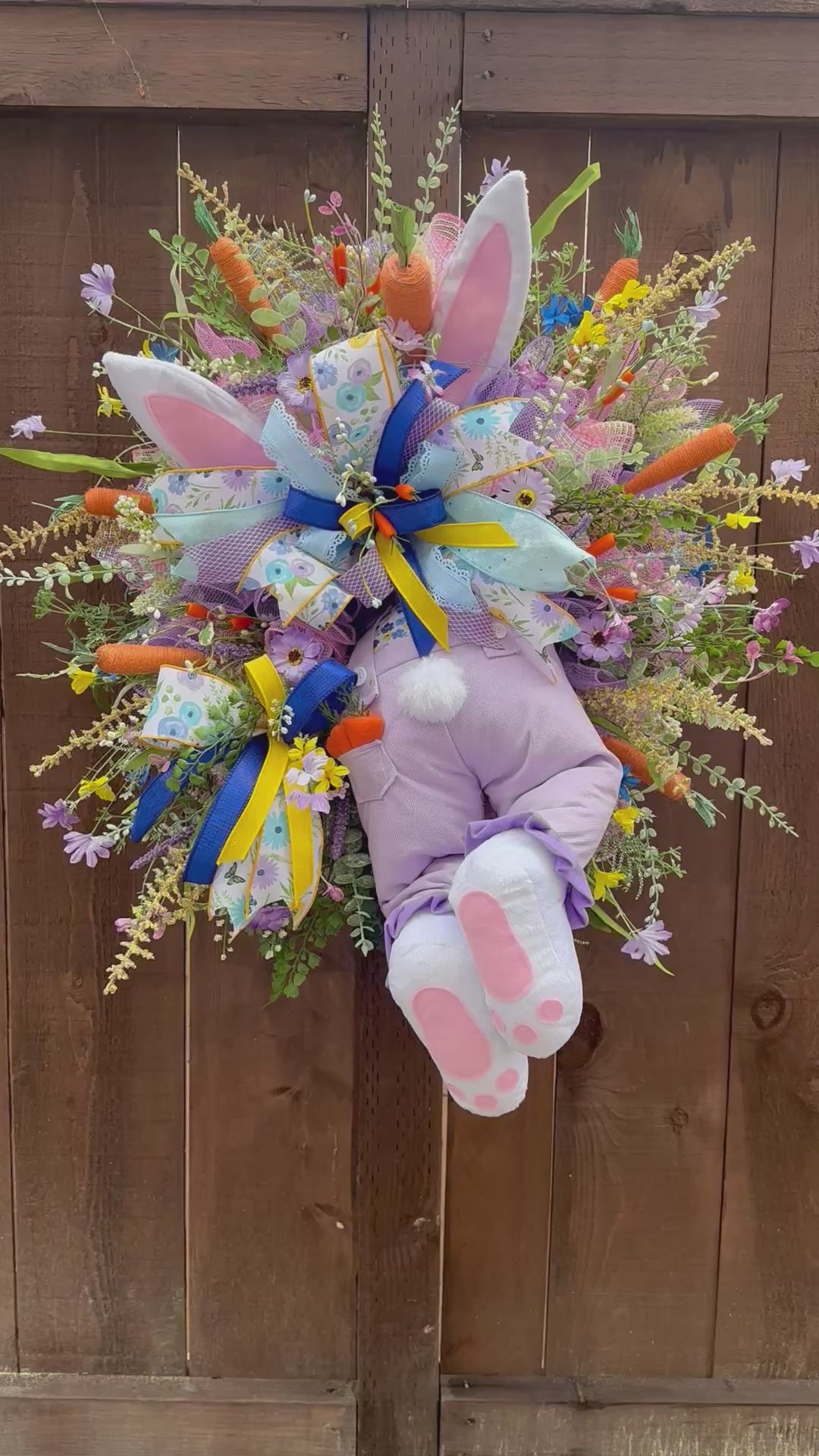 This handmade Bunny Butt Wreath is the perfect addition to your spring decor. Featuring a fun wreath attachment and stuffed with multicolored spring florals, carrots, and bright handmade bows, this one-of-a-kind wreath is sure to add a touch of whimsy to your front door. Made with attention to detail and expert craftsmanship, this wreath is a unique and charming addition to your home.