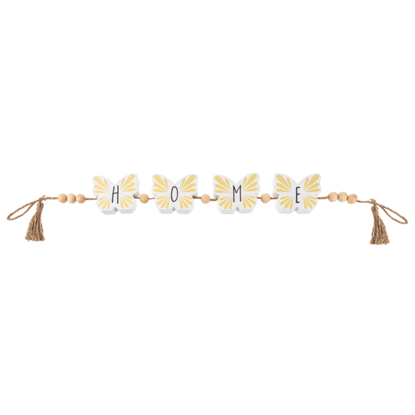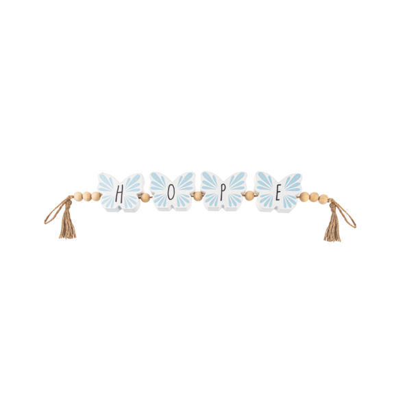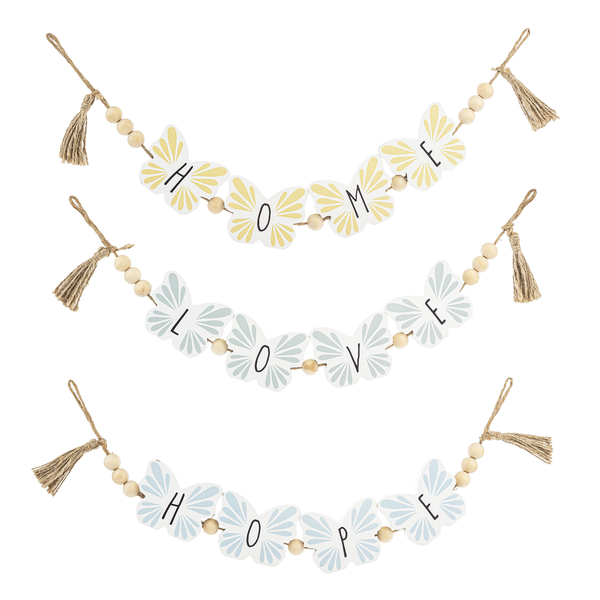 - LOVE, HOME, HOPE text painted wood butterfly "sitabouts" for your shelf or use the jute end loops to hang as a loose swag. The natural wood beads and jute fringe tassels complement this organic boho design.