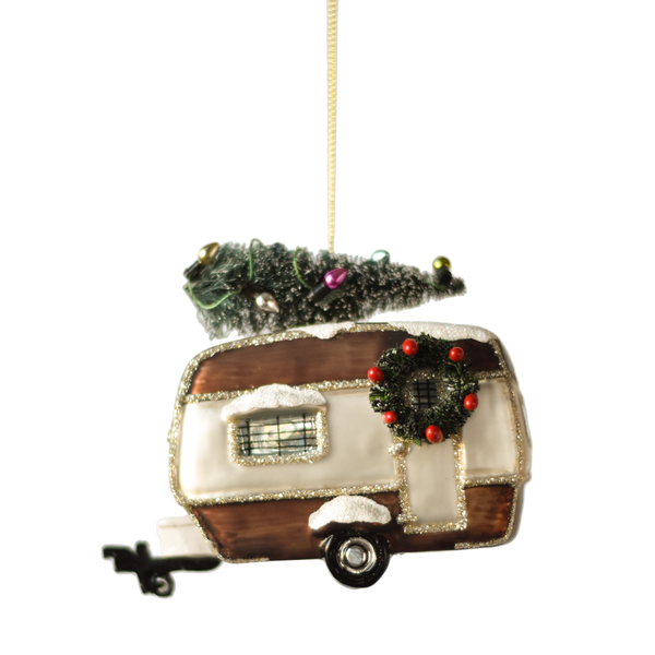 - Glass camper ornament, multicolored-brown and silver with gold glitter accents. Green bottlebrush Christmas tree with colorful lights on top and wreath on side door