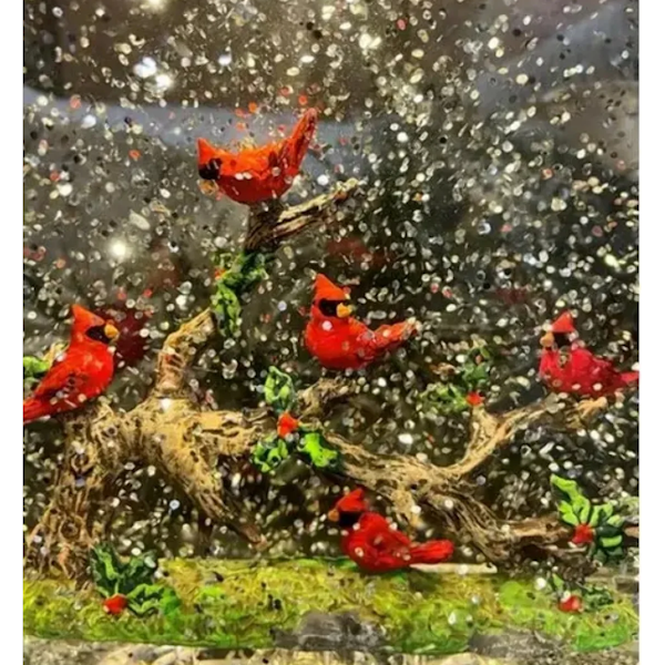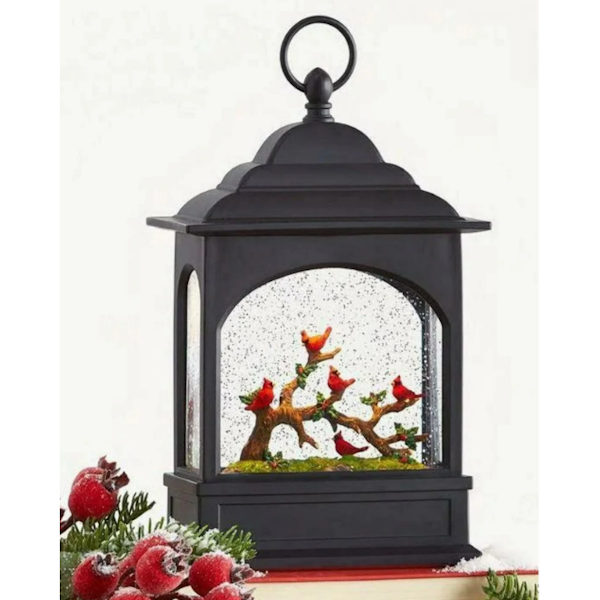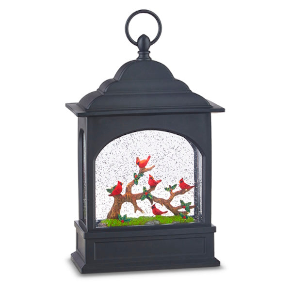 - RAZ Cardinal Water Lantern features black casing, red cardinals on brown and green tree branch with swirling silver glitter