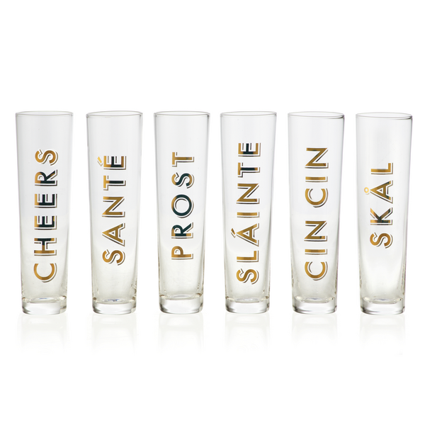 - Bring the champagne and toast with your friends in six different languages - English, French, German, Gaelic, Italian and Swedish. Clear glass with metallic gold