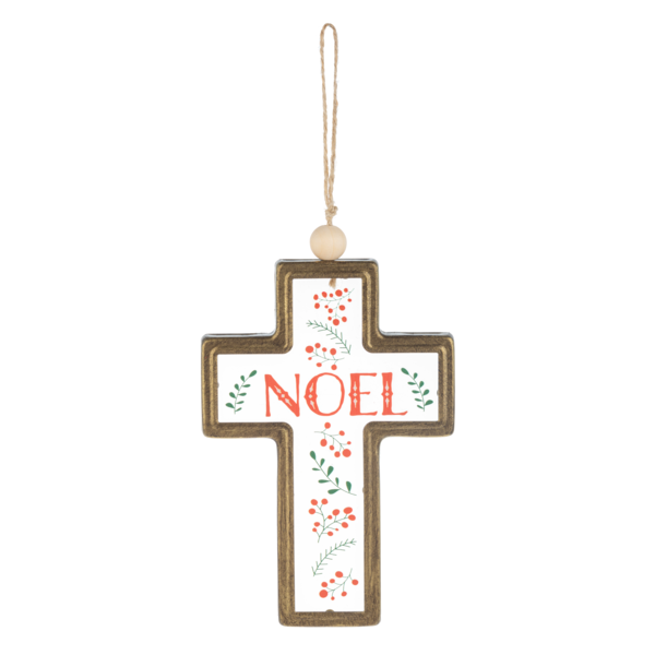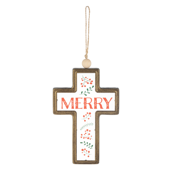 Celebrate the season with this charming Christmas Text Cross Ornament! Featuring a delicate holly and berry design printed on a clear acetate window, each ornament is framed in metal and hangs from a rustic jute string with a wooden bead. Choose from festive words like Noel, Joy, or Merry—each sold separately—to add a playful touch to your holiday décor. Perfect for spreading cheer with a unique twist!