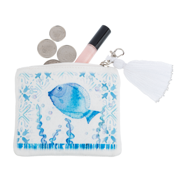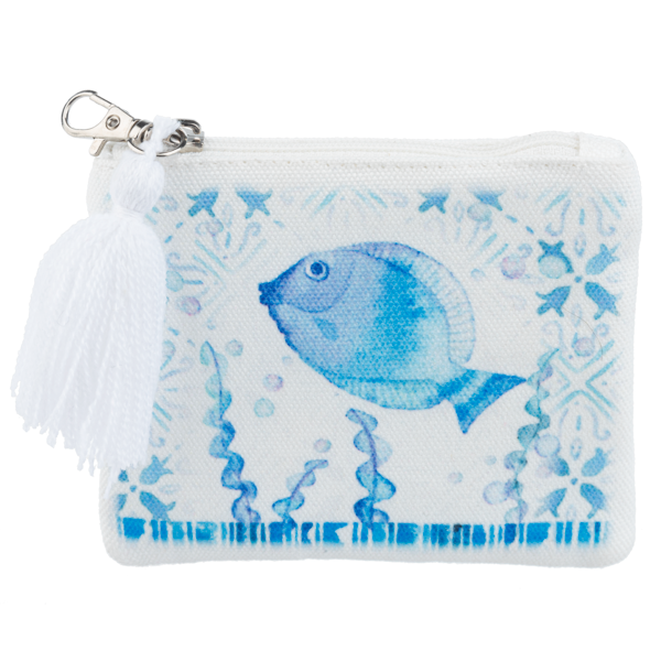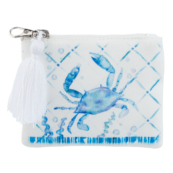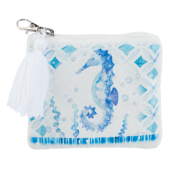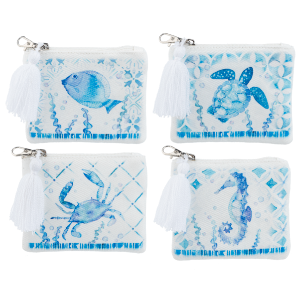 - Assorted designs of blue and white coastal critter coin purses, each with a large white tassel zipper pull and key holder. Plenty of room to hold I.D., credit cards and some pocket money for a day at the beach! Choose from Fish, Sea Turtle, Crab or Seahorse-each sold seperately