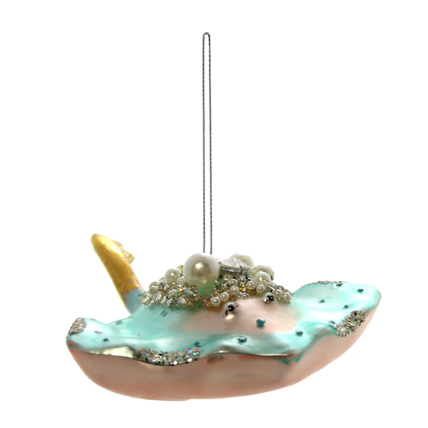 - Gorgeous aqua and pink with a touch of gold metallic, this little stingray is adorned with rhinestones, pearls, beads, crystals and glitter. It would be very pretty on your coastal tree, wreath or garland!