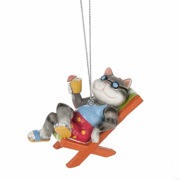 Bring a splash of fun to your décor with this Cool Cat Ornament! Featuring a laid-back tabby cat enjoying vacation vibes—cocktails in hand, rocking sunglasses, flip flops, beach chair, and tourist clothes—it's the purr-fect touch of whimsy for any space craving a sunny escape.