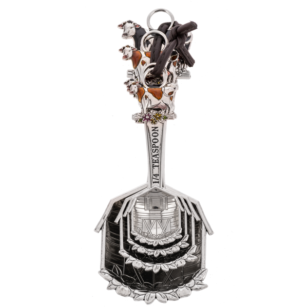 - Includes 1 ea. of 1 tbsp., 1 tsp., 1/2 tsp., 1/4 tsp. Colorful enamel design on front, plain silver and different design on backside, knotted together with a faux leather tie