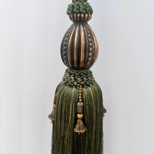 Elevate your window treatments with the Crown Tieback in Olive Mix. This refined accessory features a copper-colored metal head and coordinating beads, complemented by a luxurious tassel. The olive mix fabric showcases a sophisticated blend of green, gold, and black threads, adding subtle depth and dimension to your décor. A perfect balance of elegance and texture for a polished, timeless look.