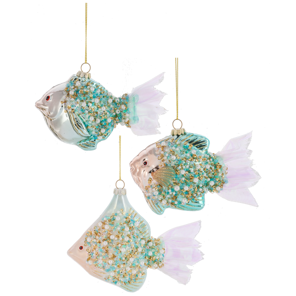 Enhance your home decor with our elegant Jewel-Crusted Glass Fish Ornament. Each fish features iridescent milky paints, shimmery gold and blue sequins, delicate beading and pops of white pearls. The sheer fabric tails add a touch of whimsy to these stunning ornaments. Choose from 3 styles to create the perfect aquatic atmosphere, each sold separately.
