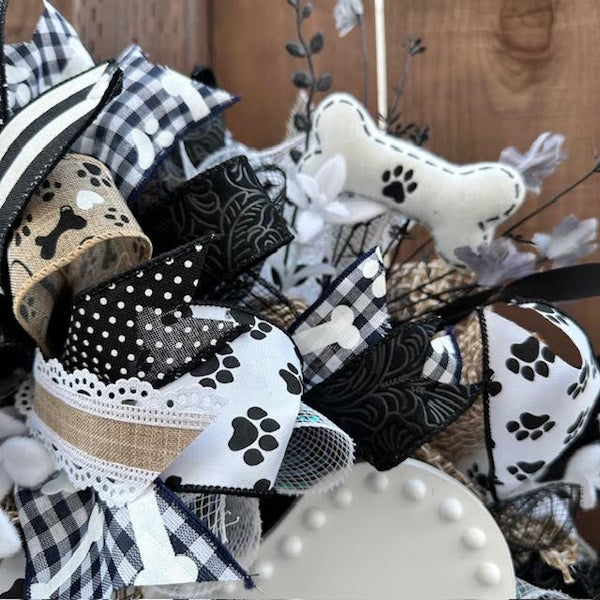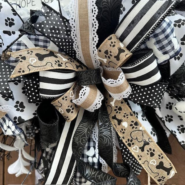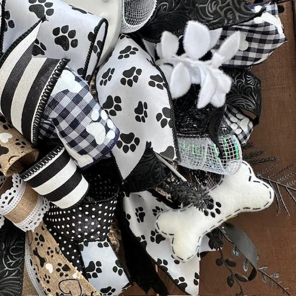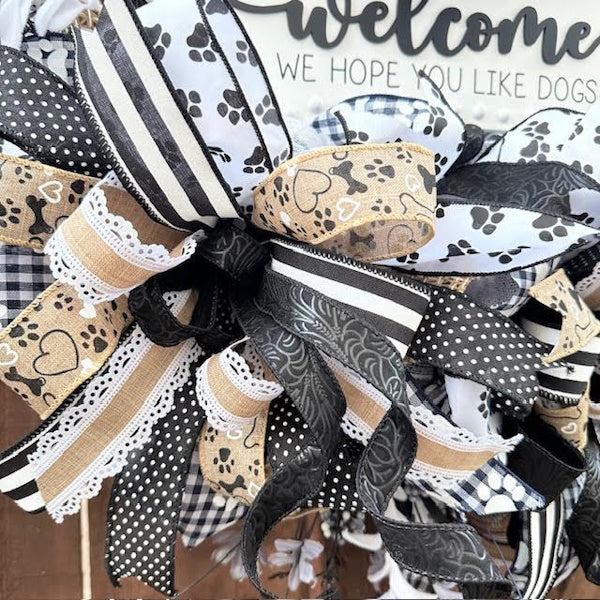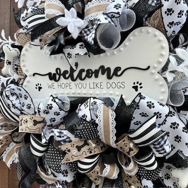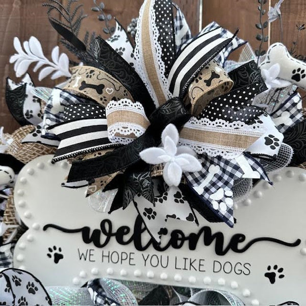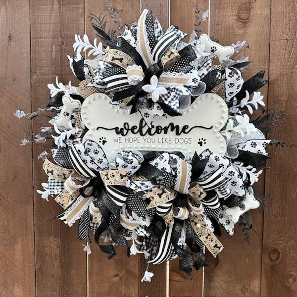- The perfect wreath for dog lovers! Greet your guests and let them know Fido will give them hugs and kisses, too! Black and white bone-shaped wood sign reads "Welcome, we hope you like dogs". Surrounded by three thick, juicy bows, florals, and bone decor, this handmade one-of-a kind wreath will bring you lots of joy throughout the year!