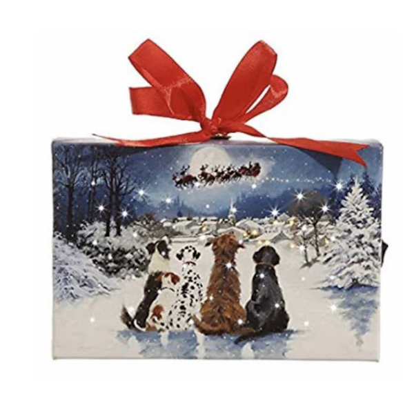 - Everybody loves dogs, and these are adorable! With twinkling lights throughout and steady lights in the village making this a delightful and whimsical feel of the holiday season. Silky red ribbon is included to be used as a hanging ornament or wall decor, but it mayalso be placed on a desktop using the built-in easel stand.