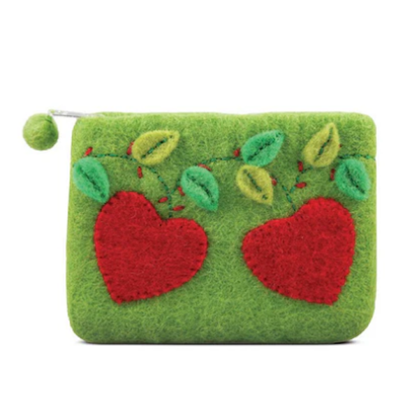 Handcrafted in Nepal, Apple green coin purse with red hearts and mixed green leaves overlay stitched and embroidered in place