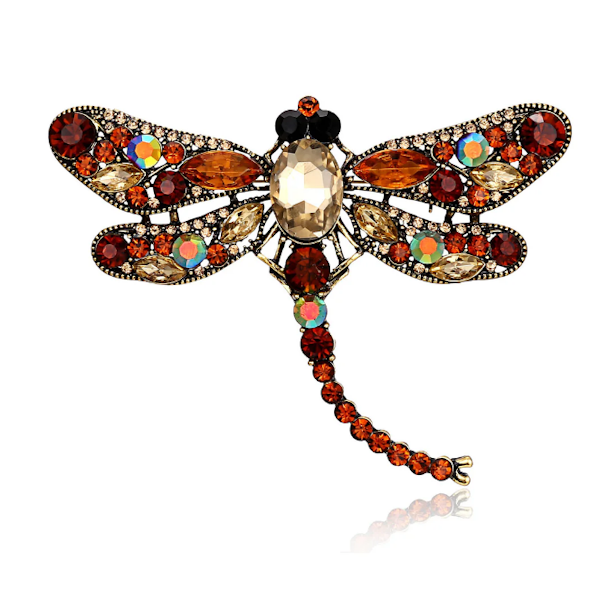 This dazzling dragonfly pin features shimmering brown and iridescent multicolored stones set on a gleaming gold-colored base. Let it flutter playfully on your blouse, jacket, or bag to add a sparkling touch of charm and personality to any outfit.