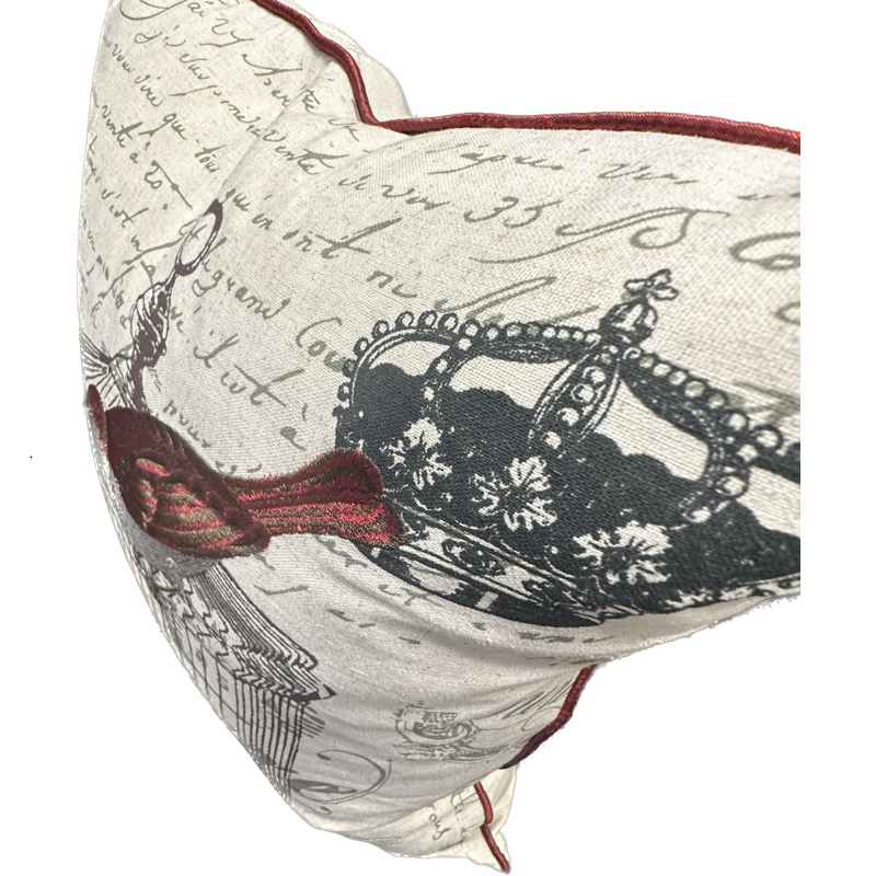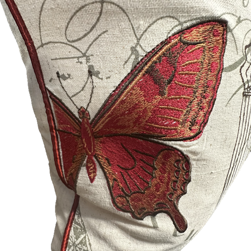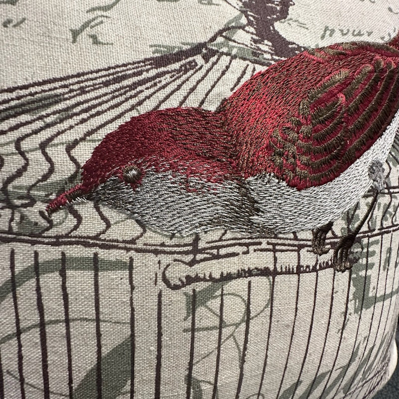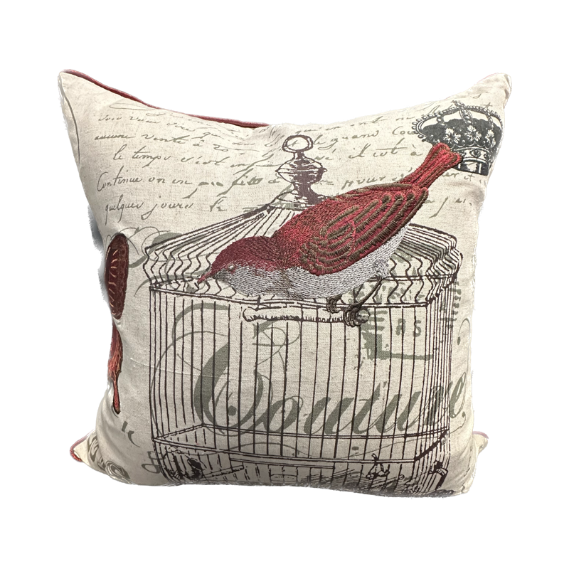 - Beige ground cloth, embroidered red sparrow and butterfly, printed grey/dark grey words, birdcage and crown, Solid beige back. Zipper closure.