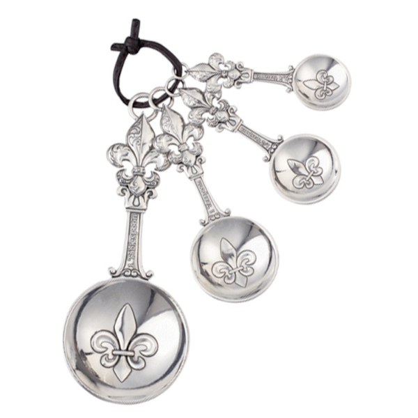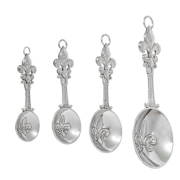 - Includes 1 ea. of 1 tbsp., 1 tsp., 1/2 tsp., 1/4 tsp. Different designs on front and back side with lots of intricate details, all spoons knotted together with a faux leather tie