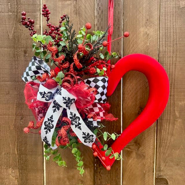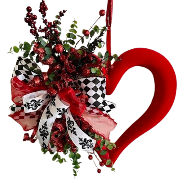 - Red Flocked Heart shaped door hanger/wreath is perfect for Valentine's Day! Custom greenery with festive red balls, hearts and swirls tied up with beautiful ribbons and bows sit assymetrically aside the luxurious heart.