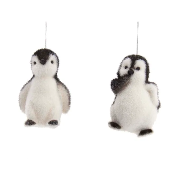 - Kurt Adler's black and white flocked baby penguin ornaments are a charming addition you will love for any holiday décor or Christmas tree. This assortment features two penguin ornaments in a flocked style, hangs from silver string. Each sold seperately.