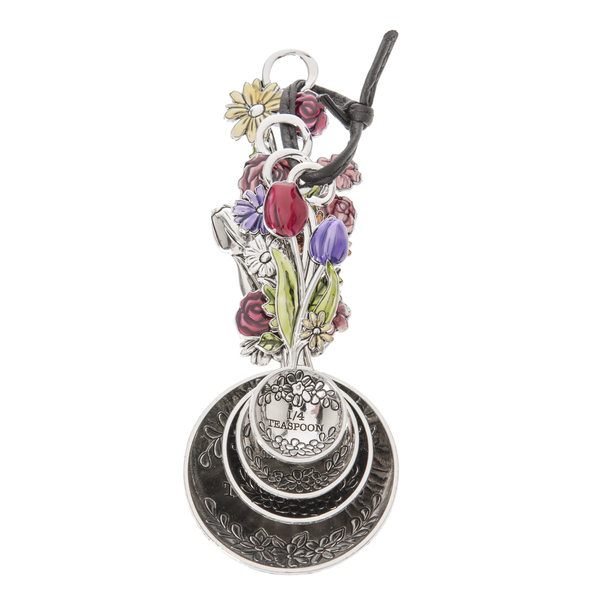 - Includes 1 ea. of 1 tbsp., 1 tsp., 1/2 tsp., 1/4 tsp. Colorful enamel design on front, plain silver and different design on backside, knotted together with a faux leather tie