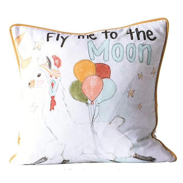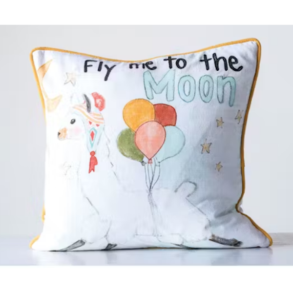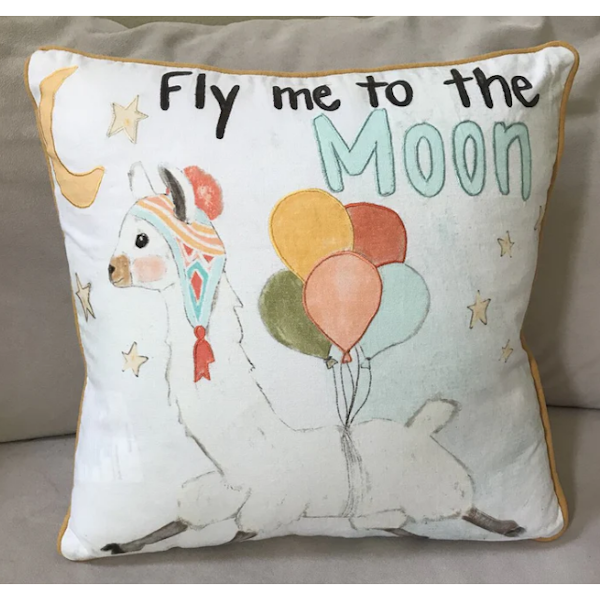 - Fun novelty toss pillow with llama and balloons "Fly me to the Moon",white cotton groundcloth with printed pattern and embroidered outline accents on face. Solid white back, yellow welt cording, and zipper closure.
