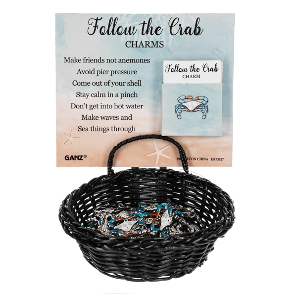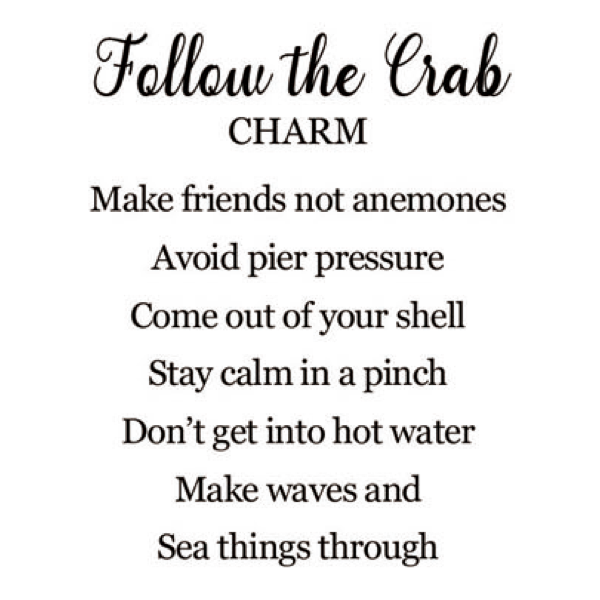 - The silver and blue Follow the Crab charm comes with a card that reads "Make friends not anemones Avoid pier pressue Come out of your shell Stay calm in a pinch Don't get into hot water Make waves and Sea things through."