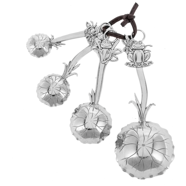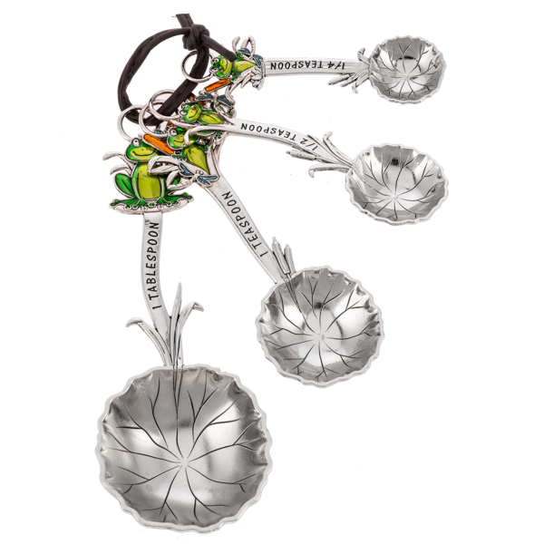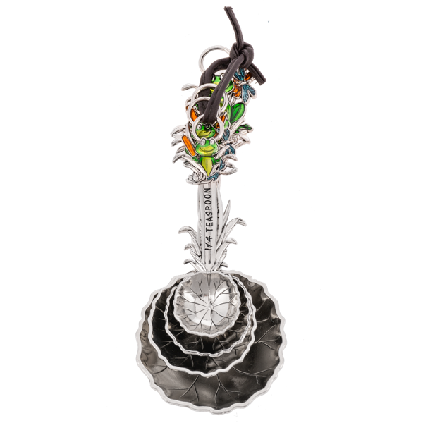 - Includes 1 ea. of 1 tbsp., 1 tsp., 1/2 tsp., 1/4 tsp. Colorful Frog enamel design on front with frogs and nesting lily pads, plain silver and different design on backside, knotted together with a faux leather tie