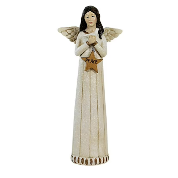 - The Angel holds a dove and gold star, symbolizing Peace and Joy. A perfect addition for those who appreciate the magical things in life!. The gold star she holds says either "Peace" or "Noel", each sold separately. Beautiful inspirational figurine to add to your everyday or holiday decor