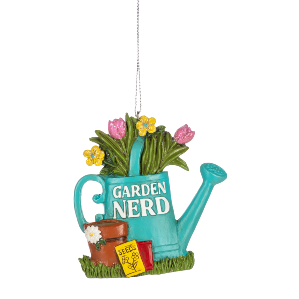 This Garden Lovers Ornament is a perfect gift for any gardener. The watering can design with "Garden Nerd" will show off their love for gardening. Made of painted polyresin, it's a delightful addition to any garden or home.