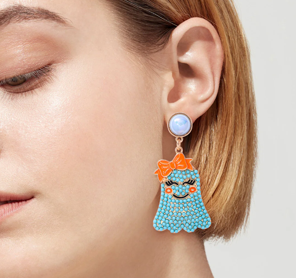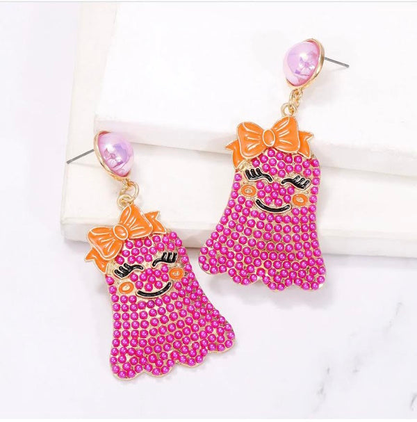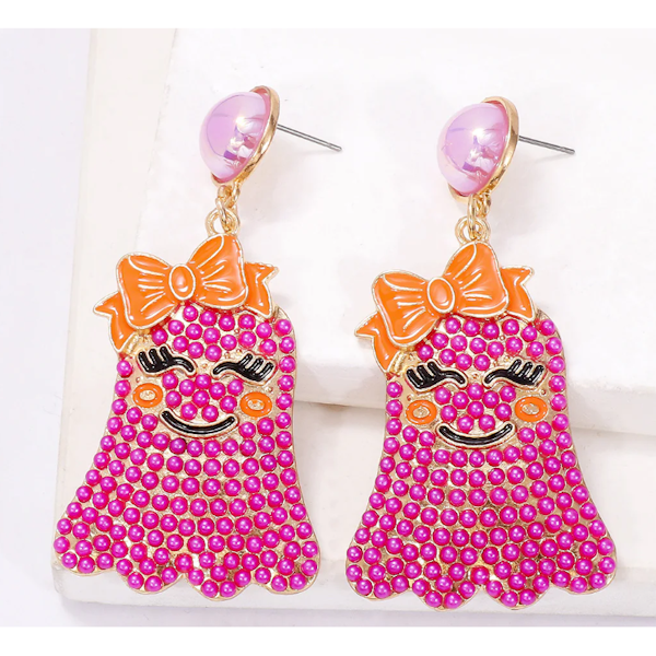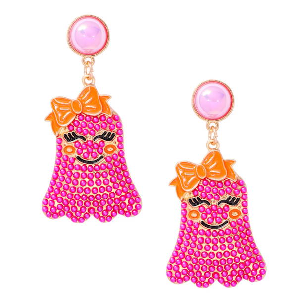 Bring a touch of playful Halloween charm to your look with these Ghost Bead Earrings in Rose Red. Featuring a cute pink smiling ghost adorned with fluttery eyelashes and a bright orange hair bow, each earring is detailed with faux pearls and painted enamel for a fun, festive vibe. Perfect for adding a bit of Summerween spirit to any outfit!
