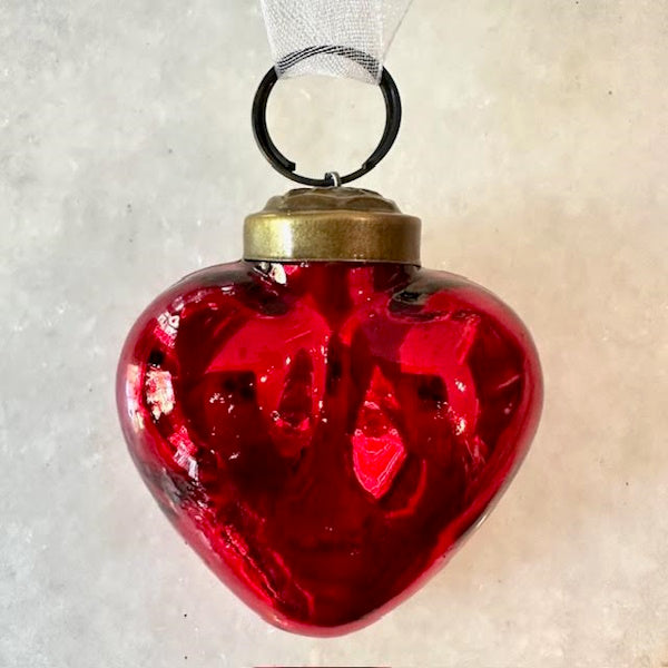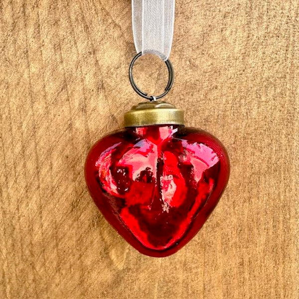 - Red Mercury Glass Heart Ornament with metal topper and 3" long white organza ribbon hanger.