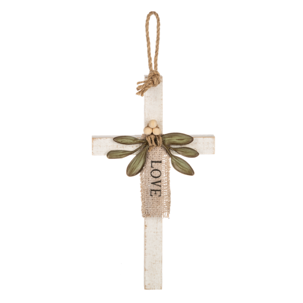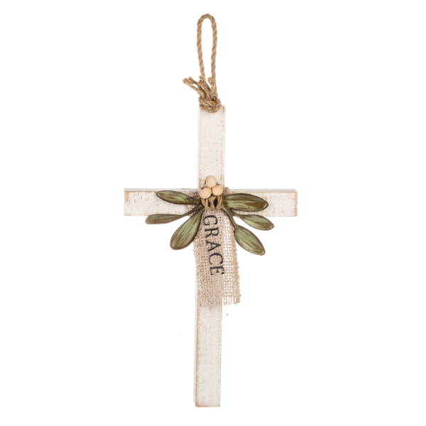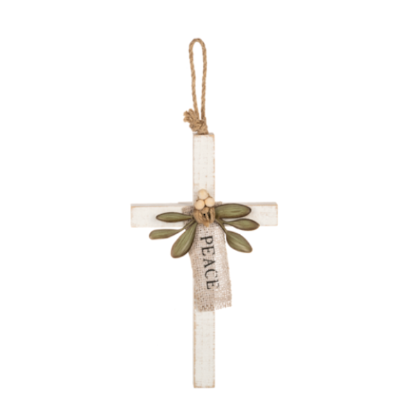 - White-wash wood cross with sage green metal olive branch and wood beads