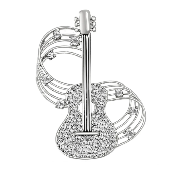 Elevate your style with this silver-colored Guitar Music Note Rhinestone Brooch. Perfectly designed to adorn your blouse, lapel, or cowboy hat, it adds a refined touch with sparkling rhinestones that catch the light subtly. This elegant accessory blends musical charm and sophistication, making it an ideal statement piece for any occasion.