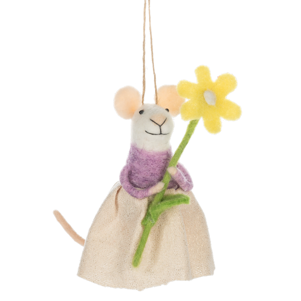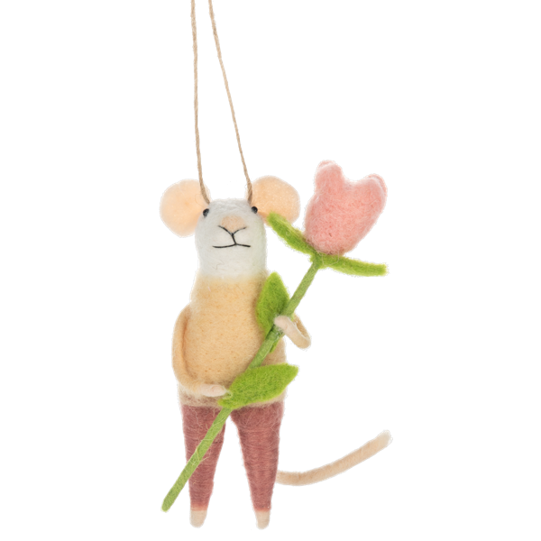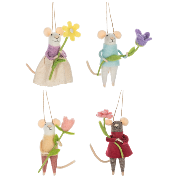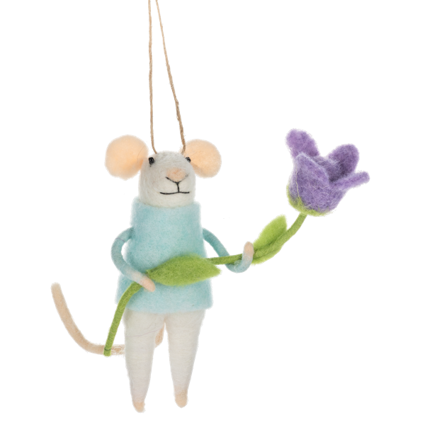 Bring joy to your home with these Handcrafted Garden Mouse Ornaments! Each adorable felted mouse clutches a large flower with a wired stem, and has a wired tail, and arms, giving it lively bendable, poseable character. Uniquely crafted, no two are exactly alike, making each a delightful surprise. Perfect to add a playful touch to your spring decor or gift separately to delight any nature lover. By the way, pair them with our Colorful House Figurines to create your own amazing whimsical tabletop scene!