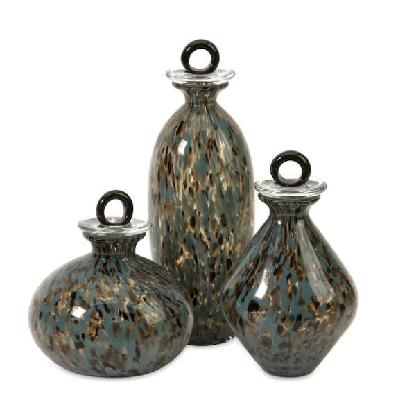 - The Harwick art glass bottles add interest to any decor in a mix of turquoise, black and metallic flecks of bronze, topped with black and clear circular finials.