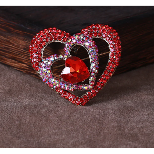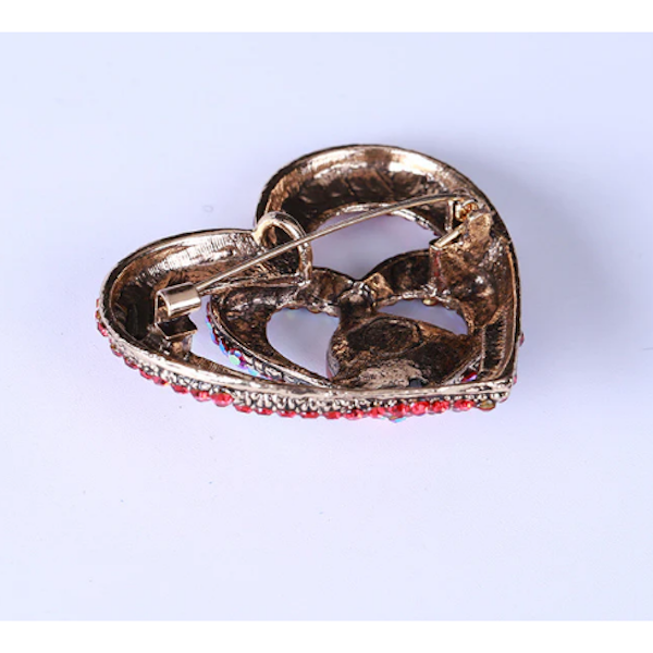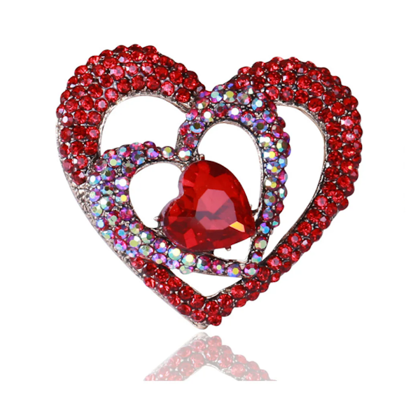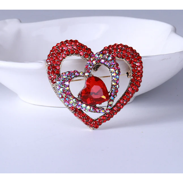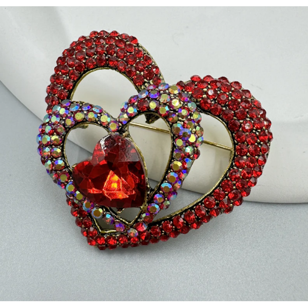 - A red hot, red Heart Brooch Pin for Valentine's Day or everyday! Wear this pin with confidence and escalate your fashion style! Gold alloy base with red and iridescent rhinestones make this a sizzling hot little go-to accessory.